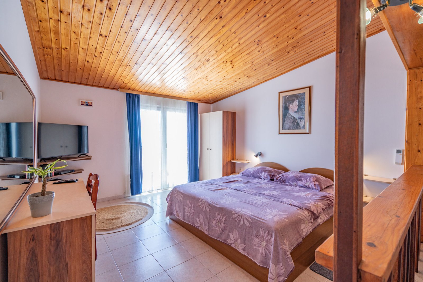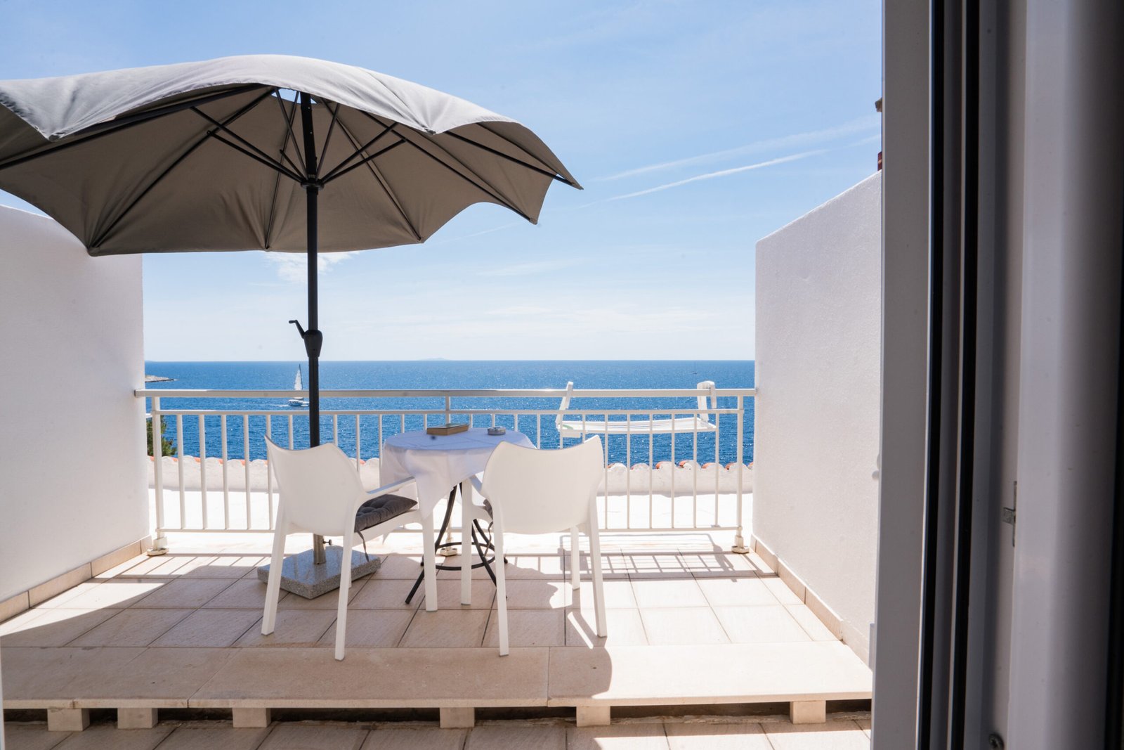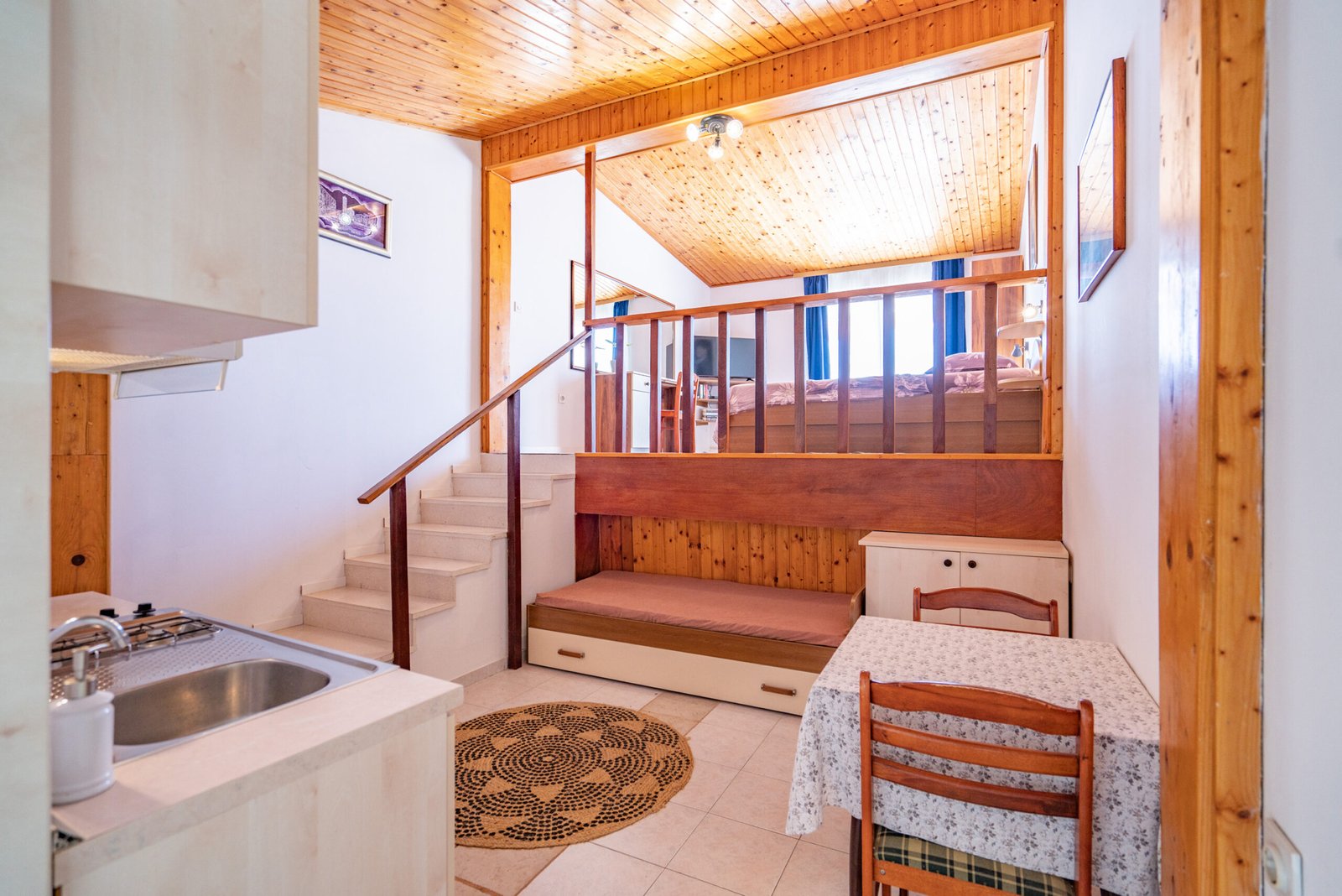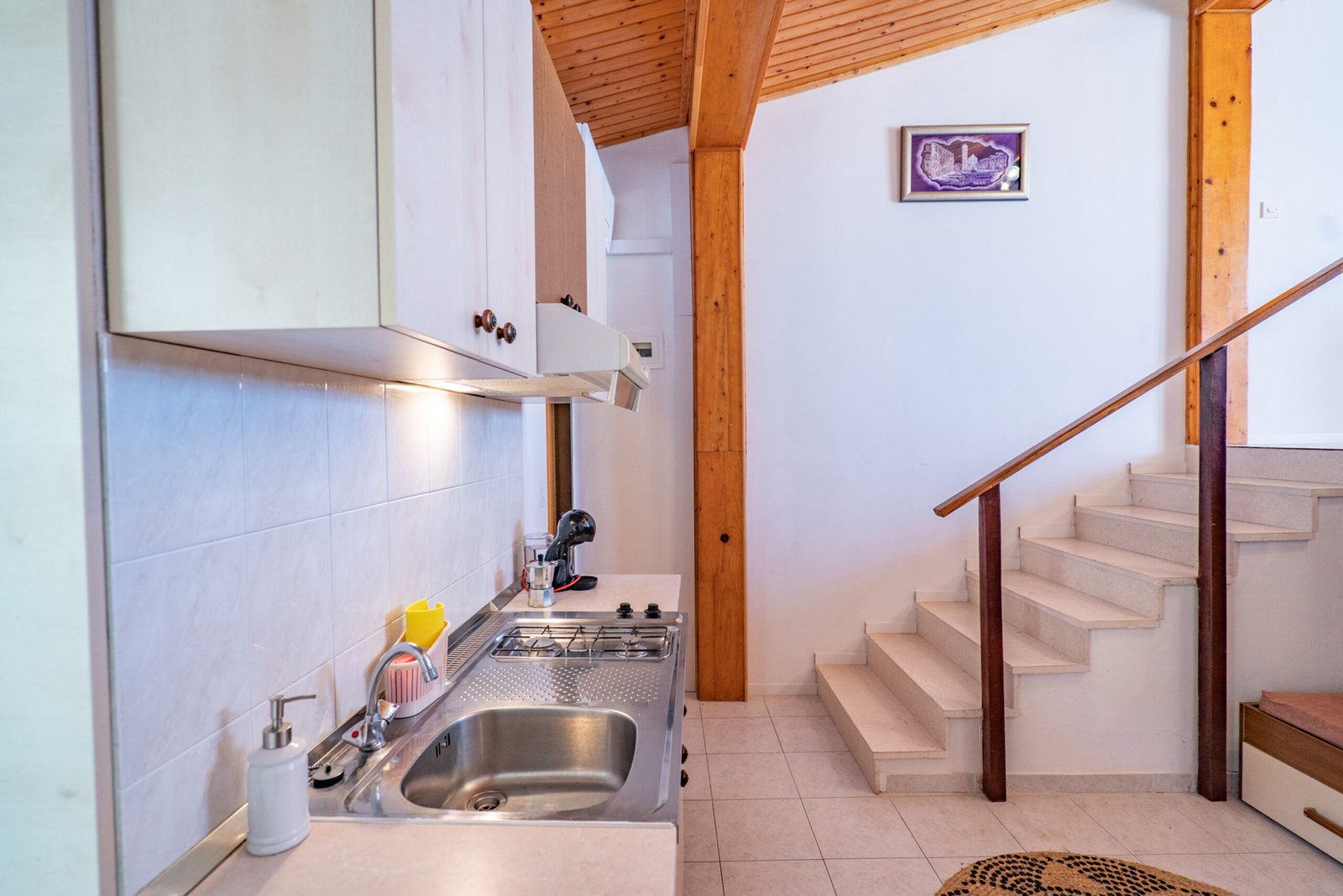 A cosy 47m2 studio loft apartment located on the 4th floor of the house, offering breathtaking views of the sea and the stunning Hvar archipelago. This apartment occupies the middle area of the top floor pointing south and is thoughtfully designed into two levels. A kitchenette with a dining area and a bathroom are placed on the ground level, and a sleeping area with a private sea-view balcony is on the upper level. Both areas are connected by a few steps. It’s ideal for a romantic getaway for two or a comfortable retreat for a small family with one child.