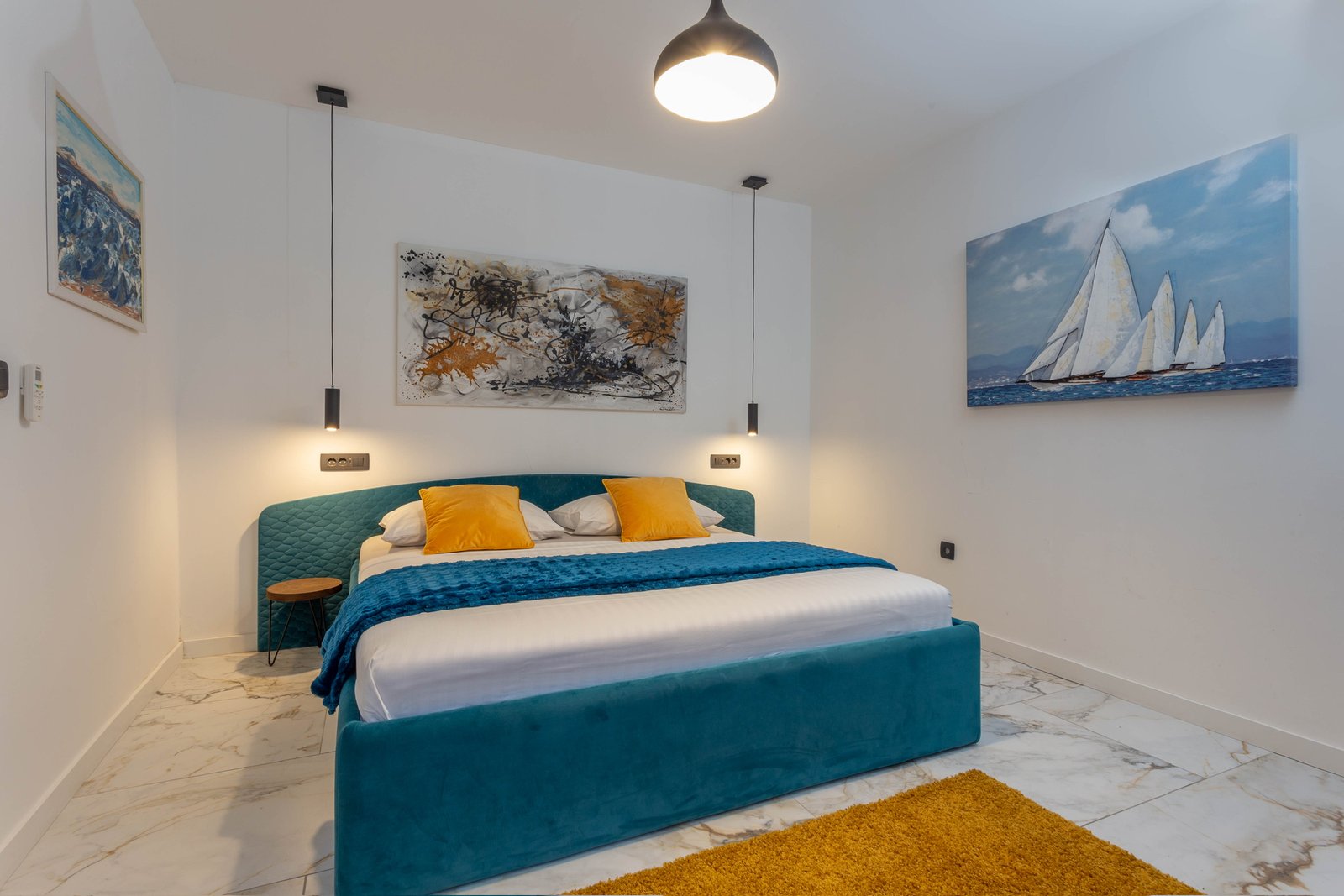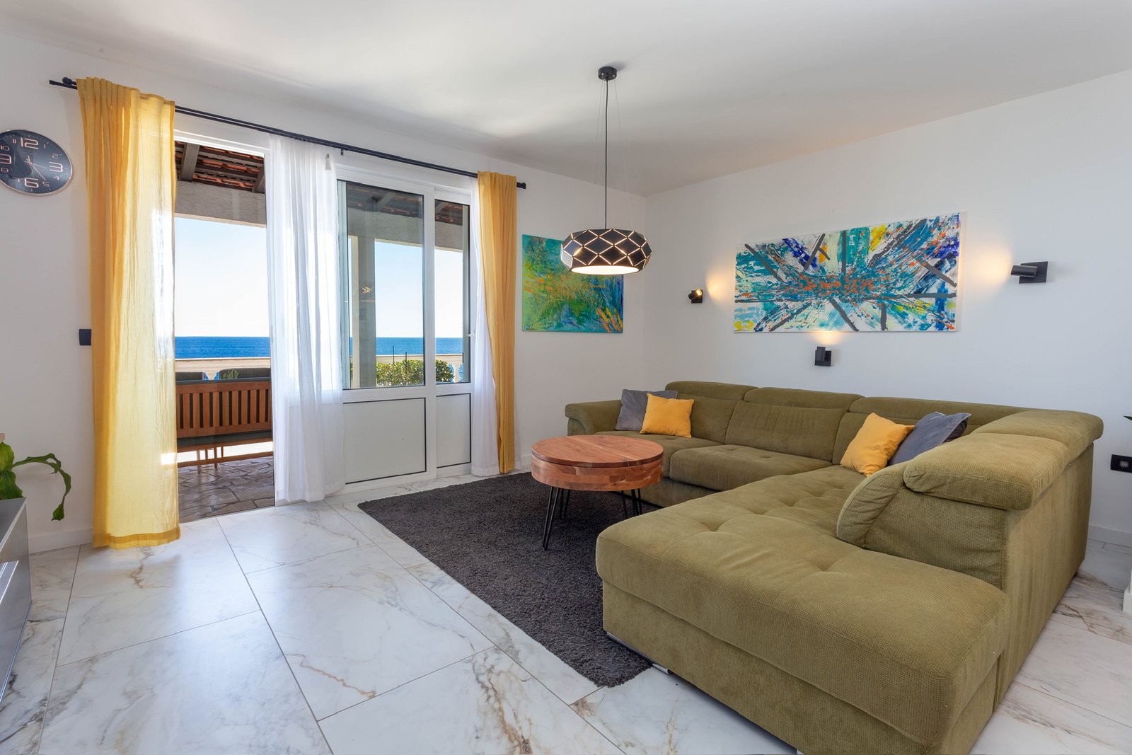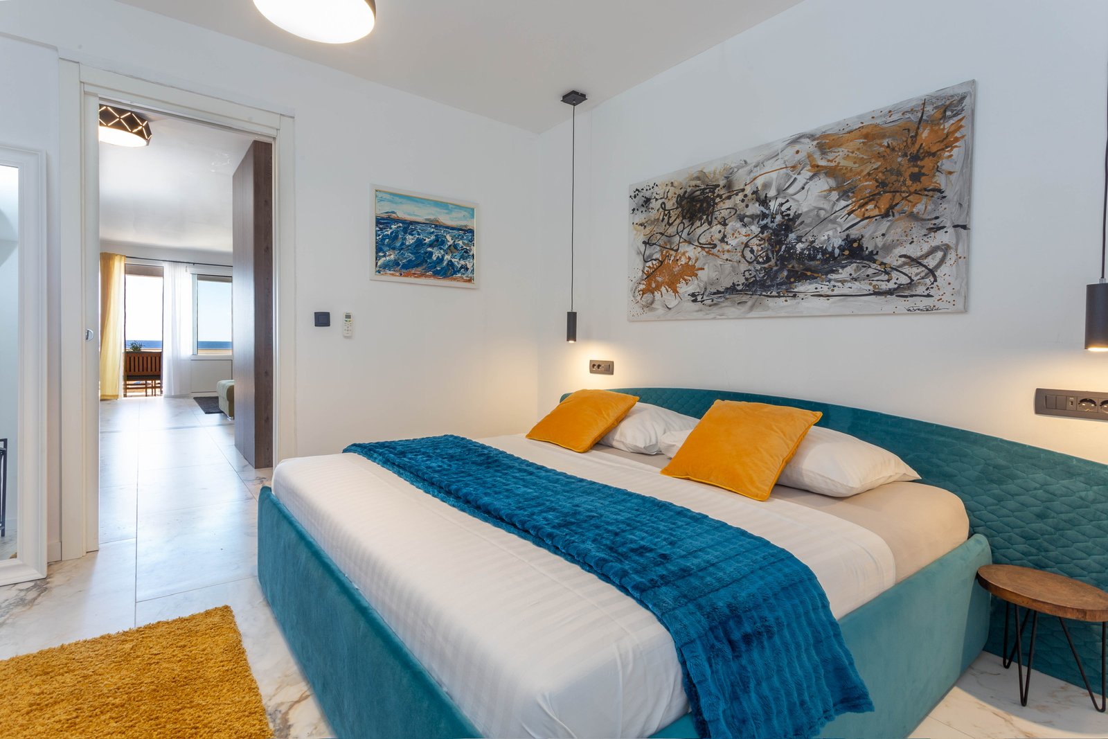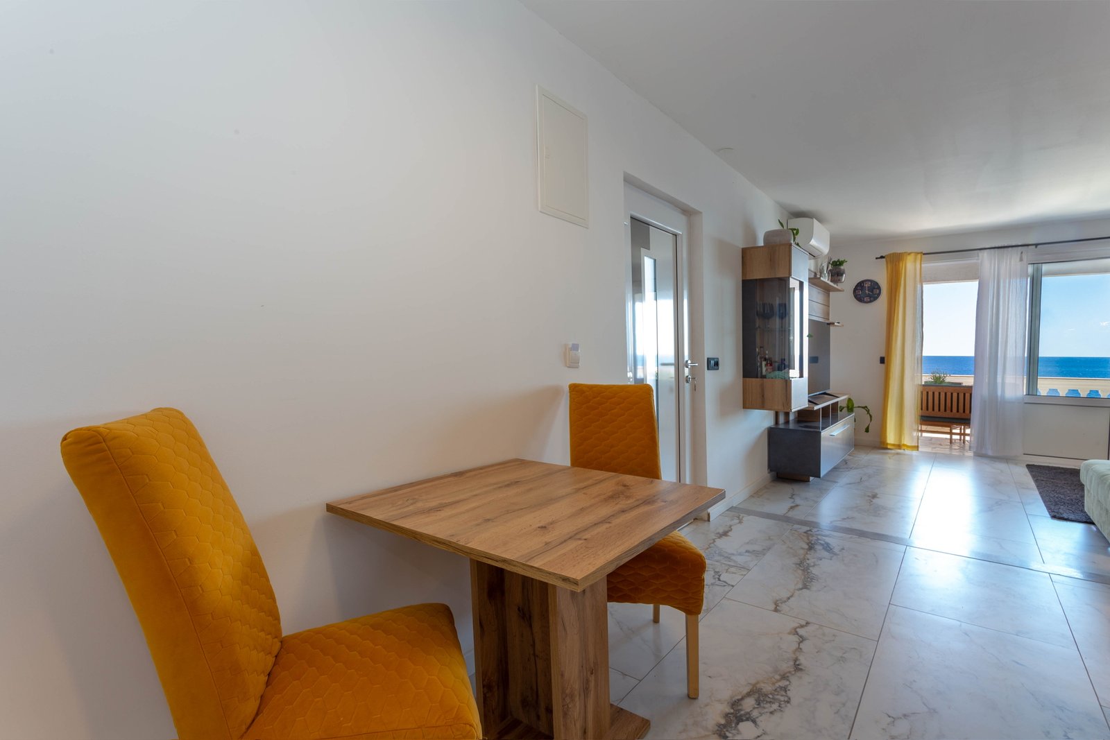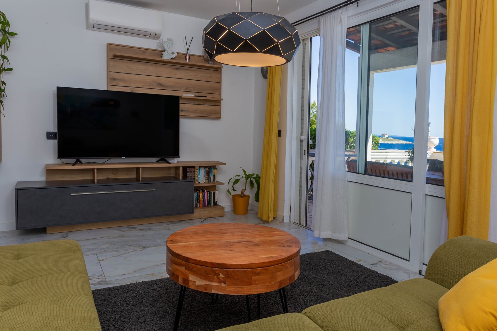 Ovaj 70m2 veliki moderan stan nalazi se na 1. katu kuće s ulazom koji dijele samo članovi obitelji, tako da je maksimalna privatnost. Sastoji se od otvorene potpuno opremljene kuhinje, blagovaonice, prostranog dnevnog boravka s udobnom sofom koja gleda na terasu, lijepe zlatne detaljne kupaonice s dva umivaonika i ogromne spavaće sobe s walk-in ormarom i slatkim toaletnim stolićem. Velika vrata za terasu omogućuju dovoljno prirodnog svjetla tijekom dana, a grilje zamračuju stan. Ulazna vrata se otključavaju ključ karticom. Ovaj apartman je savršen za parove koji vole prostran život i koji vole uživati u prirodi, tihim jutrima, šarenim večerima s prekrasnim pogledom na more.
