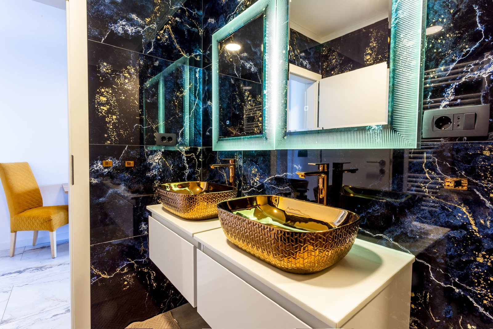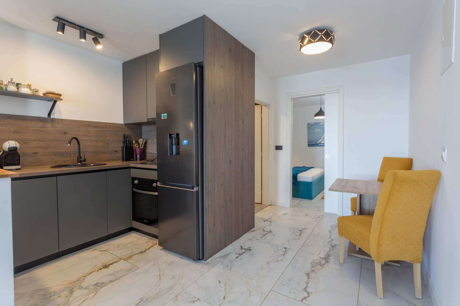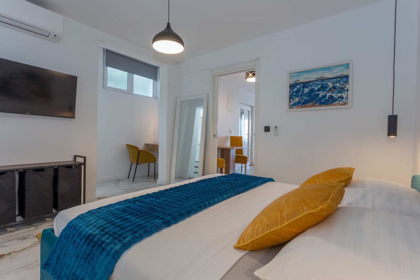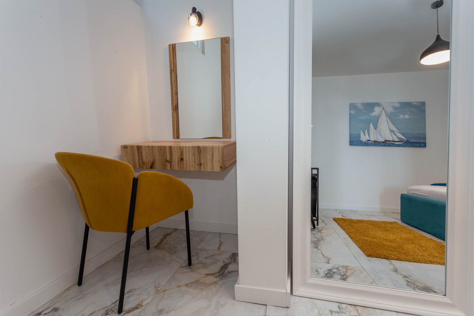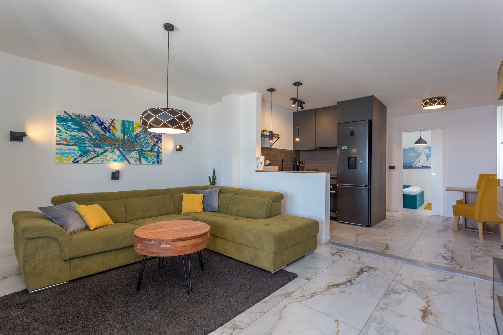 Ovaj 70m2 veliki moderan stan nalazi se na 1. katu kuće s ulazom koji dijele samo članovi obitelji, tako da je maksimalna privatnost. Sastoji se od otvorene potpuno opremljene kuhinje, blagovaonice, prostranog dnevnog boravka s udobnom sofom koja gleda na terasu, lijepe zlatne detaljne kupaonice s dva umivaonika i ogromne spavaće sobe s walk-in ormarom i slatkim toaletnim stolićem. Velika vrata za terasu omogućuju dovoljno prirodnog svjetla tijekom dana, a grilje zamračuju stan. Ulazna vrata se otključavaju ključ karticom. Ovaj apartman je savršen za parove koji vole prostran život i koji vole uživati u prirodi, tihim jutrima, šarenim večerima s prekrasnim pogledom na more.