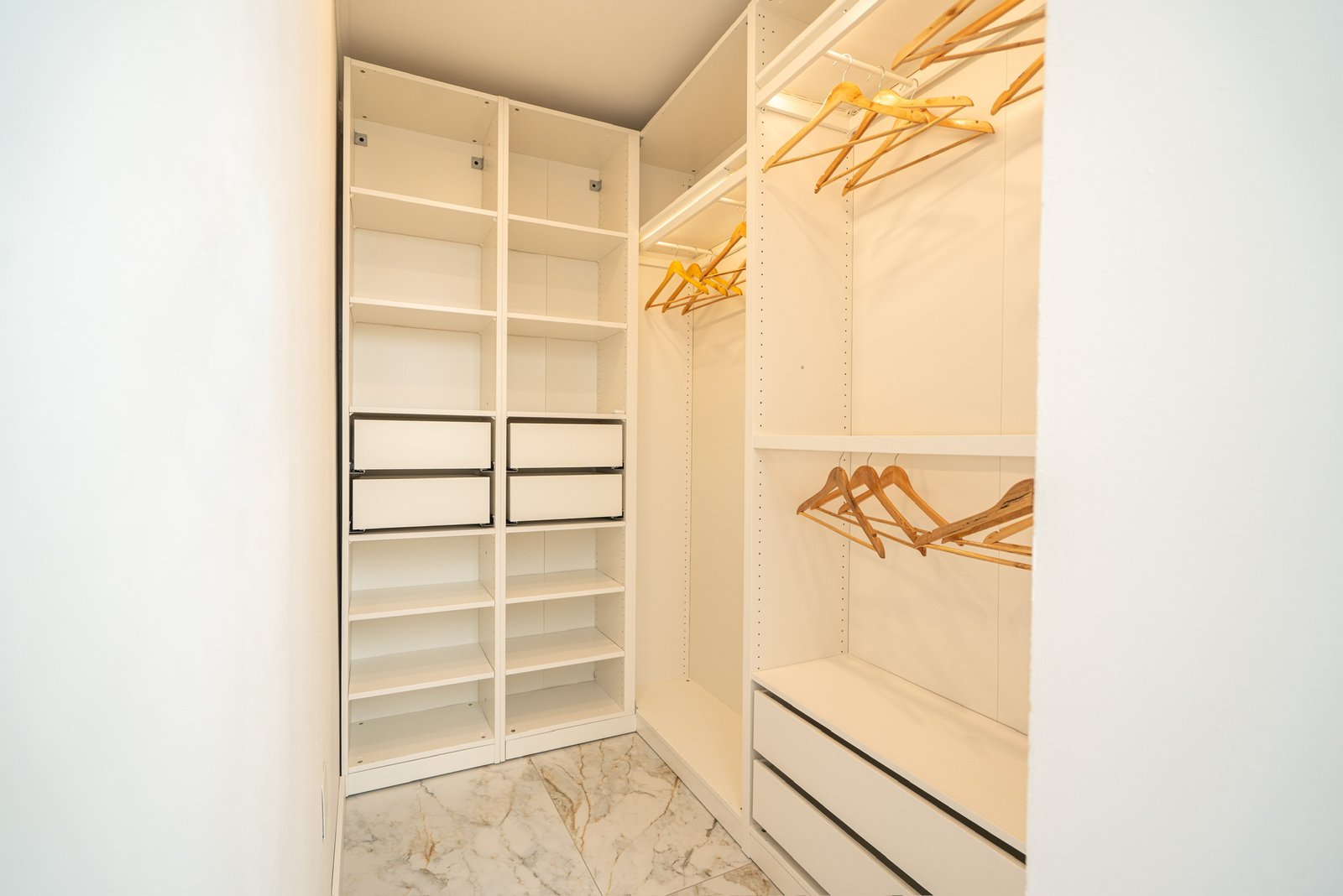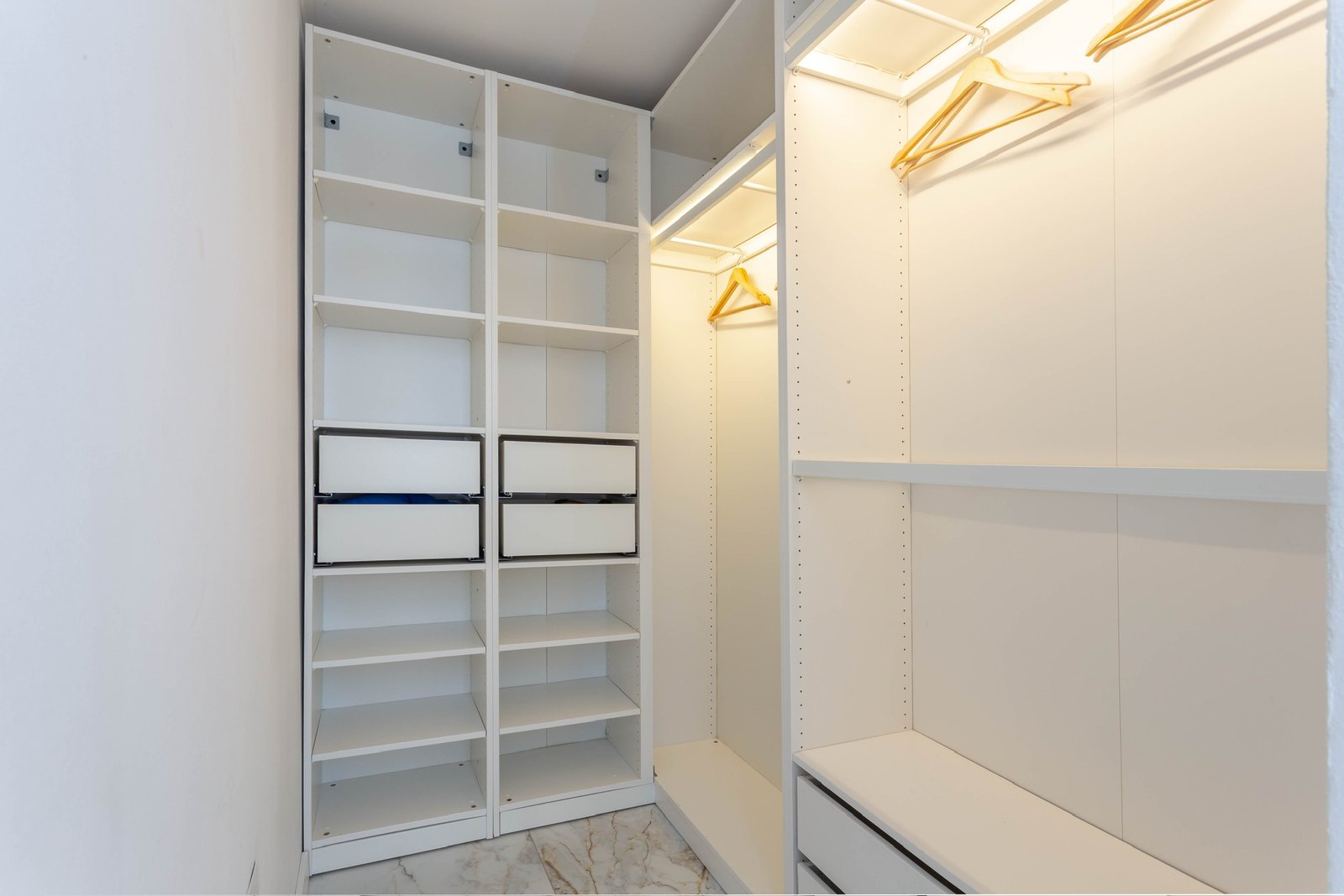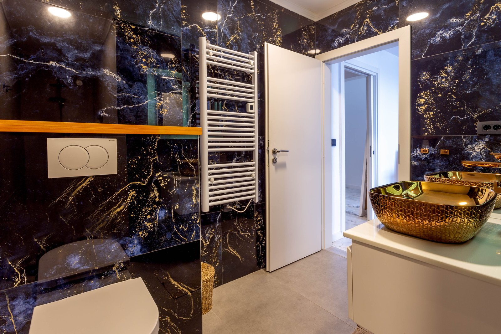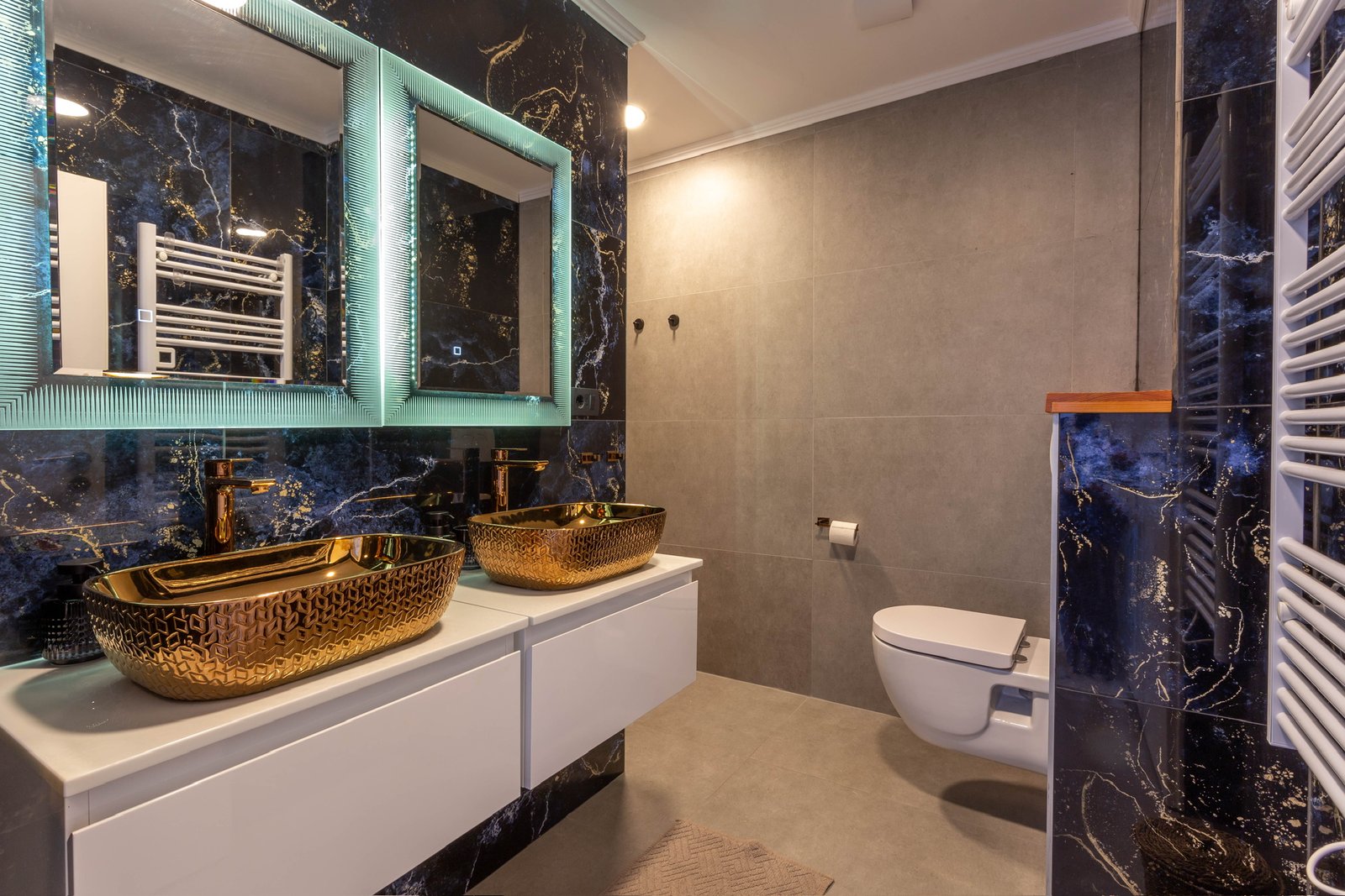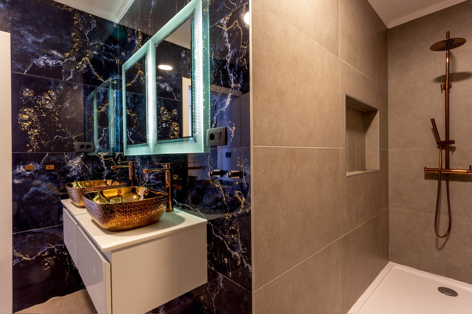 Ovaj 70m2 veliki moderan stan nalazi se na 1. katu kuće s ulazom koji dijele samo članovi obitelji, tako da je maksimalna privatnost. Sastoji se od otvorene potpuno opremljene kuhinje, blagovaonice, prostranog dnevnog boravka s udobnom sofom koja gleda na terasu, lijepe zlatne detaljne kupaonice s dva umivaonika i ogromne spavaće sobe s walk-in ormarom i slatkim toaletnim stolićem. Velika vrata za terasu omogućuju dovoljno prirodnog svjetla tijekom dana, a grilje zamračuju stan. Ulazna vrata se otključavaju ključ karticom. Ovaj apartman je savršen za parove koji vole prostran život i koji vole uživati u prirodi, tihim jutrima, šarenim večerima s prekrasnim pogledom na more.